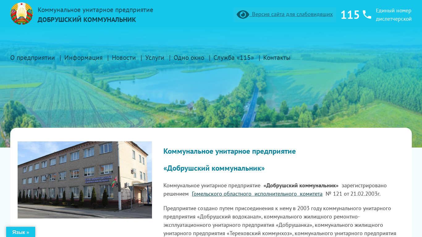 | SEO-описание | Добруш Коммунальник: является государственным объединением жилищно-коммунального хозяйства Гомельской области. |