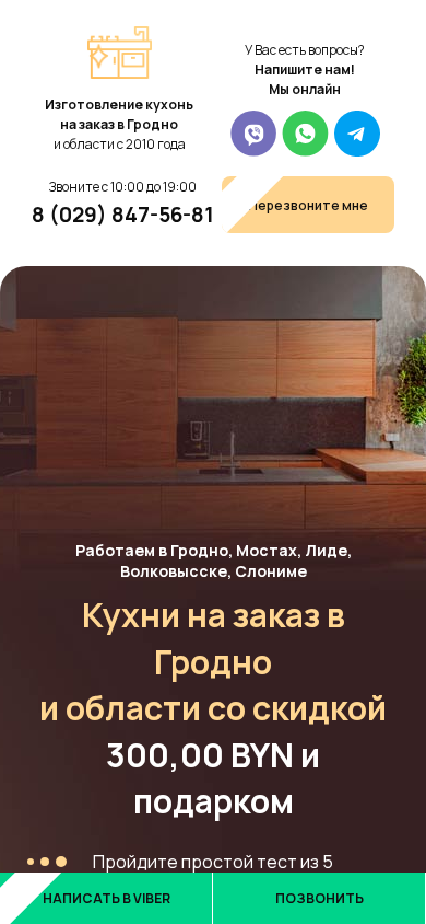 | AI-анализ | --- The portal zakaz-kuhni.by is a custom-made kitchen ordering service based in Grodno and the surrounding regions in Belarus. It has been in operation since 2010. Visitors can get a quote for their desired kitchen in three different variants, along with a free 3D project, by completing a simple test consisting of five questions. The website offers a discount of 300,000 BYN and a free extractor hood as a promotion for orders placed before September 30th, 2021. Users can choose the type, size, and materials of their kitchen, as well as specify where they would like to receive the quote. The website is available for contact via Viber, Telegram, WhatsApp, and phone. |