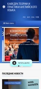 | AI-анализ | --- The web project "eng-lang.gsu.by" is the homepage of the Department of Theory and Practice of English Language at the Belarusian State University named after F. Scorina. The main menu provides access to sections about the chair, news, faculty, disciplines, courses, and various events. The site contains information about the history of the department, its staff and their specialties, as well as educational processes and academic programs. The page also offers access to useful links, student clubs, and repositories of research papers and educational materials from the university. The latest news section features information about pro-orientation events at various schools, inviting students to consider studying at the department. The site is in Russian and Belarusian languages. |