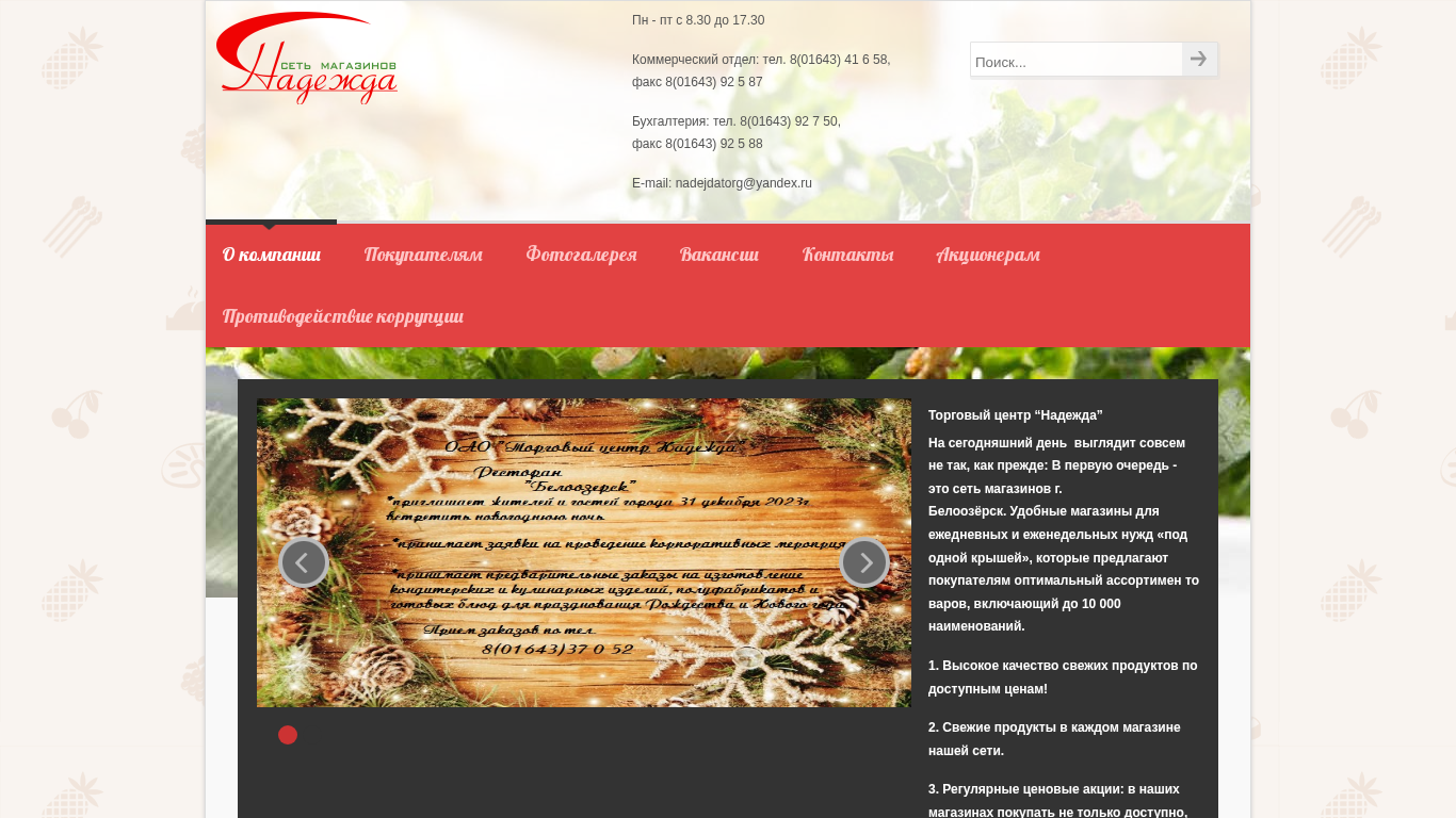 | AI-анализ | This website is a company based in Belarus with multiple retail stores under the names "Надежда" (Hope), "Дом Торговли" (Trading House), "Универсам" (University), "Чарауница", "Чебурашка" (Cheburashka), "Стройка", "Продтовары" and "Продукты". The company offers a wide range of products with over 10,000 items in total. The website provides information about the company, contact details including phone numbers, fax numbers and email address, and sections for customers such as news, customer feedback, and a guestbook. Regular price discounts and news are also featured. The website includes links to various retail stores and vacancies. There is also a section for shareholders with information on company history, discount cards, and the |