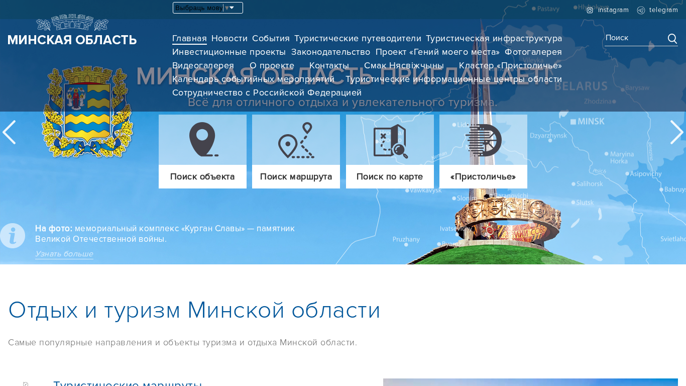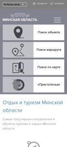 | AI-анализ | --- The website Minoblturism.gov.by is dedicated to tourism and leisure in the Minsk region of Belarus. The site offers various tourist information, including news, events, tourist routes, and infrastructure projects. It also features sections on investments, legislation, and a project called 'Genius of My Place'. The website offers multimedia content such as photo and video galleries, and includes information about tourist information centers, cooperation with the Russian Federation, and contacts. The most popular tourist attractions and destinations in the Minsk region are highlighted, including the National Park 'Narochansky' and the ski resorts 'Lugoysk' and 'Sichy'. The site is available in Belarusian and Russian languages, with sections for Instagram and Telegram. |