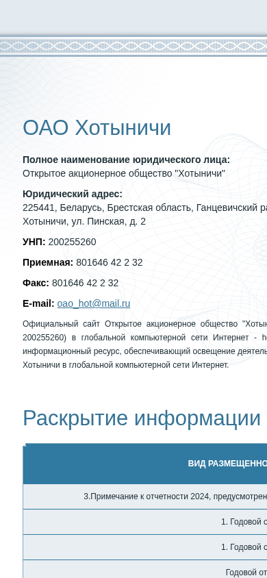 | AI-анализ | This website is the informational resource of Open Joint Stock Company "Hotynichi" (UNP 200255260) located in Belarus. The website provides access to various reports, including annual reports and auditor's conclusions, for the years 2021 to 2025. Users can download these reports in PDF format. The website also includes a section for registering and accessing a personal cabinet with login and password features. The domain name is hot.epfr.by. |