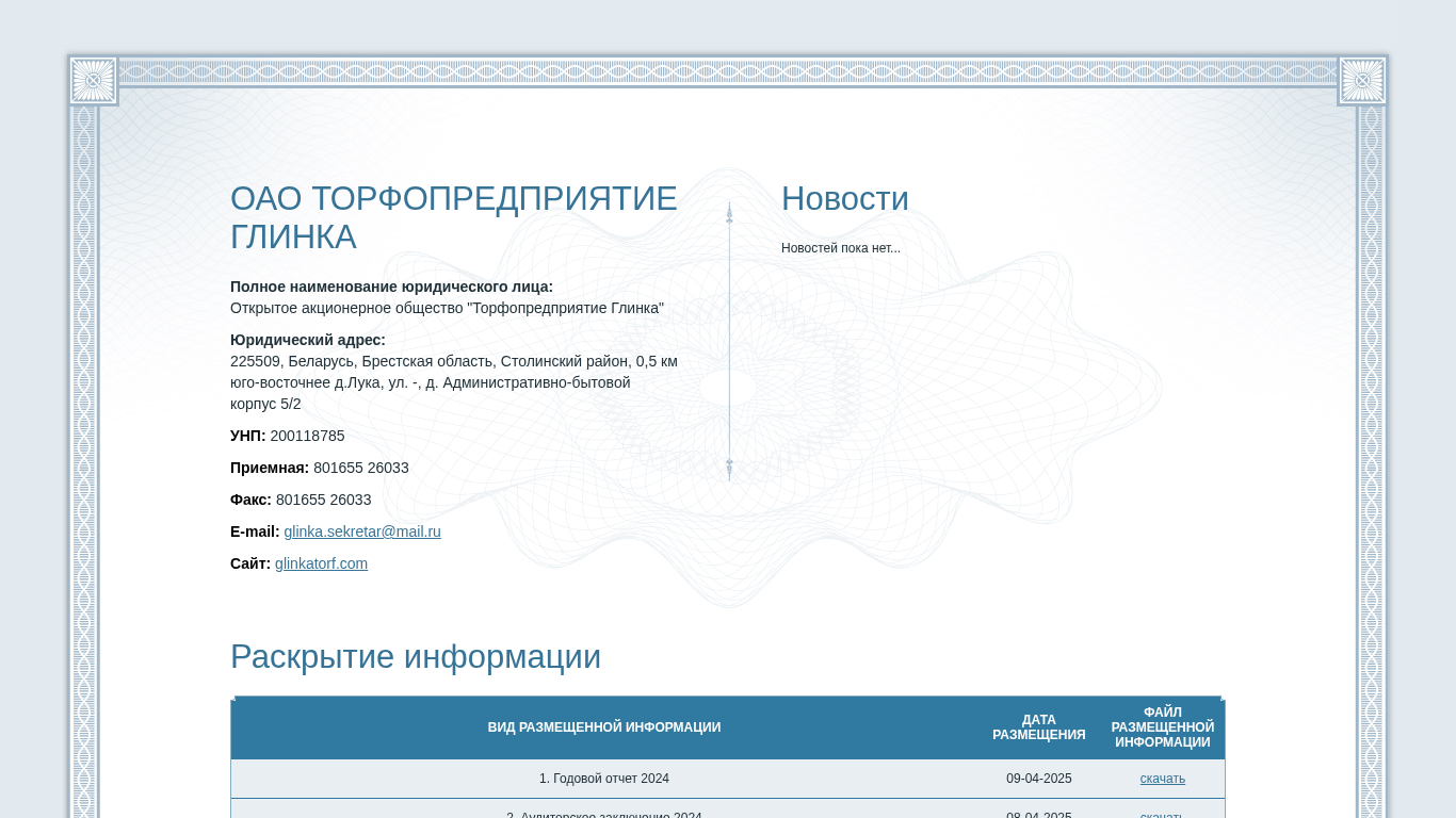 | Название / Заголовок | ТОРФОПРЕДПРИЯТИЕ ГЛИНКА ОАО |