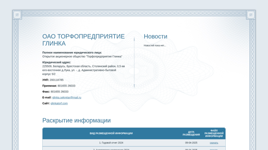 | AI-анализ | This online resource belongs to Open Joint Stock Company "Torfopredpriyatie Glinka" (OJSC Torfopredpriyatie Glinka). The company's legal name and address are provided: Open Joint Stock Company, Torfopredpriyatie Glinka, 225509, Belarus, Brest Oblast, Sotolin District, 0.5 km southeast of the village of Luka, ul. [blank], d. Administrative-residential building 5/2. The website's domain is glinkatorf.epfr.by. The primary content of this website includes various financial reports and auditor's conclusions for the years 2017 to 2024. These documents, available for download, include annual reports and dividend payments information. The reports are labeled with their |