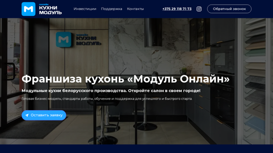 | AI-анализ | The website is for a franchise business of kitchen showrooms called "Модуль Онлайн" in Belarus. The title and description suggest buying a franchise for a "Модуль Онлайн" kitchen salon. The business model is proven and efficient. The website provides information on investment, support, and contacts, including a phone number for a callback. The franchise offers modular kitchens made in Belarus and the opportunity to open a salon in one's city. The business model includes standards for operation, training, and support for a successful and quick start. The website invites partnerships in Belarus and offers the possibility of exclusive rights in certain regions. Cities available for salon opening include Slonim, Slutsk, Slohimsk, Soligorsk, Svetlogorsk, and others, with some cities not listed. The investment for opening a salon |