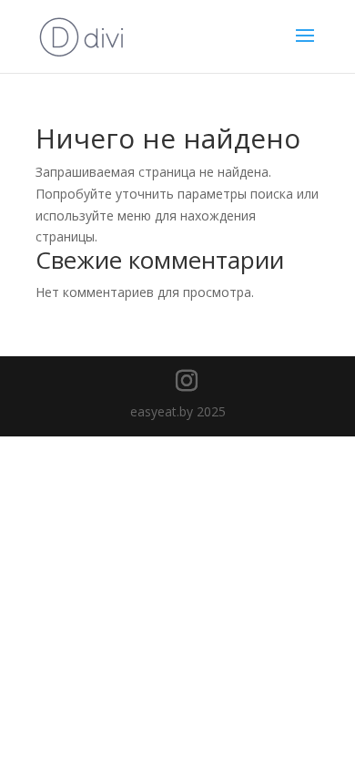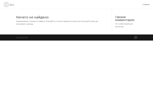 The portal easyeat.by is a Belarusian website with a title "easyeat.by" and a description that is currently empty. The top keywords for this website are "easyeat" which appears twice, and "страницу" and "найдено" which each appear once. Other top words include "выбрать", "поиска", "параметры", "нахождения", "страницы", and "меню". The homepage greets visitors with a message that no requested page was found and suggests they try to refine their search parameters or use the menu to find the desired page. There are no fresh comments for viewing on the site, but an Instagram account with the name easyeat.by is active in the year 2025.