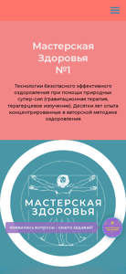 | Название / Заголовок | Мастерская Здоровья №1 – технологии безопасного эффективного оздоровления при помощи природных супер-сил (гравитационная терапия, терагерцевое излучение). Десятки лет опыта концентрированные в авторской методике оздоровления |