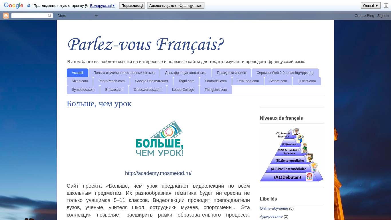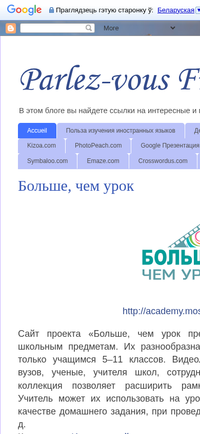 | AI-анализ | This online resource, EllerFrancenio.blogspot.com.by, is a blog that offers links to interesting and useful websites for individuals studying and teaching the French language. Keywords related to this website include 'French', 'language', 'learning', 'web 2.0', and 'education'. The blog's title, 'Parlez-vous Français?' (Do you speak French?), suggests its focus. The website provides access to various services such as LearningApps.org, Kizoa.com, PhotoPeach.com, Google Presentations, Tagul.com, PhotoVisi.com, PowToon.com, Smore.com, Quizlet.com, Symbaloo.com, and Emaze.com. These websites offer diverse learning materials for students and teachers, including video lessons, interactive activities, and multimedia resources. The blog also |