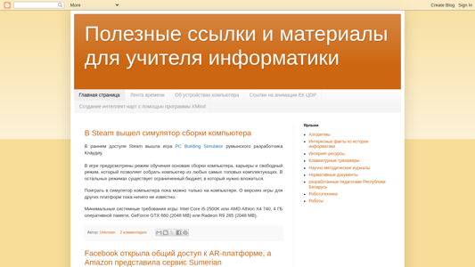 | AI-анализ | This online resource is titled "Useful Links and Materials for an Informatics Teacher" and provides links and materials for educators in the field of informatics. The homepage includes a news feed, sections on computer devices, animations, and links to intellectual card creation using XMind. A new computer building simulator game, PC Building Simulator, was recently released on Steam with a focus on teaching the fundamentals of computer assembly. The game features various modes, including a learning mode, career, and free build, allowing users to construct a computer using top components, with limited budgets in the other modes. The game can only be played on a computer at present, with no information available on future versions for other platforms. The minimum system requirements for the game are an Intel Core i5-2500K or AMD Athlon X4 740 processor, 4 GB of RAM, and |