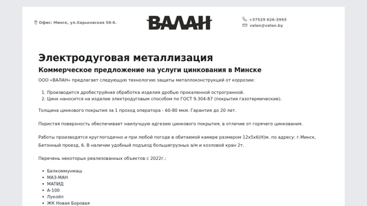 | Название / Заголовок | Электродуговое цинкование и дробеструйная обработка в Минске. ООО ВАЛАН |