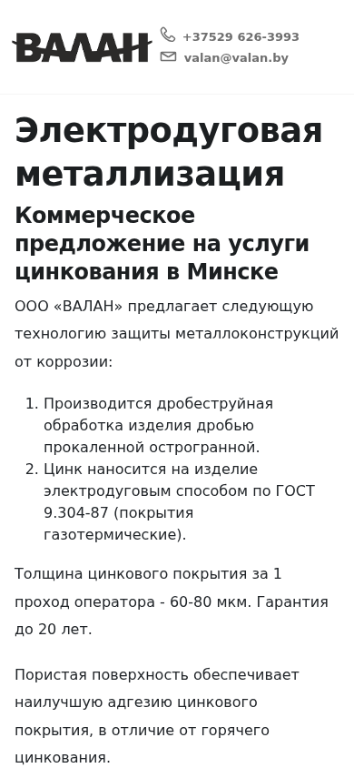 | AI-анализ | The portal is a business website for OOO VALAN, a company located in Minsk, Belarus, specializing in electrode welding galvanization and dross grinding processing. The company offers protection of metal constructions from corrosion using the technology of dross grinding and electrode welding galvanization according to the GOST 9.304-87 standard (gas-thermal coatings). The thickness of the zinc coating per pass is 60-80 microns, and the guarantee is up to 20 years. The porous surface ensures the best adhesion of the zinc coating, unlike hot-dip galvanizing. The works are carried out year-round and in any weather in a living chamber with dimensions of 12x5x6(N)m, located at Minsk, Betonnyi project, 6. The |