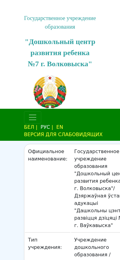 | AI-анализ | This online resource is the official website for "Дошкольный центр развития ребёнка №7 г. Волковыска" (Preschool Centre for Child Development No.7 in the city of Volkovysk, Belarus). The website is available in Belarusian, Russian, and English versions for users with varying proficiency levels. The title of the website is "Дошкольный центр развития ребёнка №7 г. Волковыска" (Preschool Centre for Child Development No.7 in the city of Volkovysk). The description of the website mentions the institution's leadership, work schedule, objectives and functions, and historical background. The keywords include "образования" (education), "день" (day), "учреждения" (institutions), "дошкольного" (preschool), |