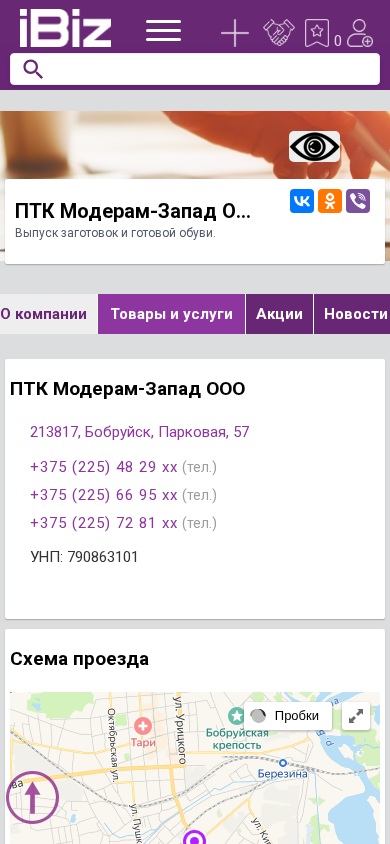 | Название / Заголовок | ПТК Модерам-Запад ООО - Выпуск заготовок и готовой обуви.. 213817, Бобруйск, , Парковая, 57 |