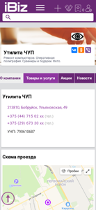 | AI-анализ | The web project "Utilita CHUP" is a business based in Bobruisk, Belarus, located at Ul'yansky Avenue 49. The company offers computer repair services, operational printing, souvenirs and gifts, and features a photo gallery. Contact information includes two phone numbers: +375 (44) 715 02 xx and +375 (29) 673 30 xx. The business hours are from 9:00 AM to 6:00 PM, Monday through Saturday, with no lunch break. The company is listed under the categories "Repair and Maintenance of Computer Technology" and "Gifts and Souvenirs" in Yandex's business directory. |