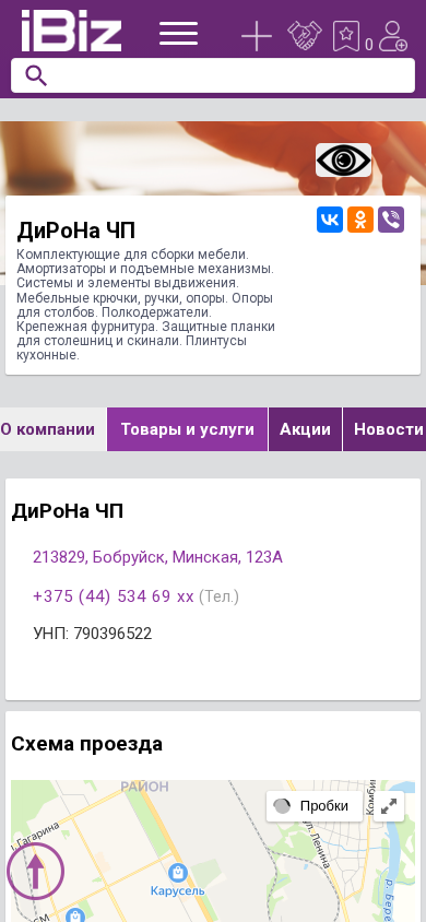Название / ЗаголовокДиРоНа ЧП - Комплектующие для сборки мебели. Амортизаторы и подъемные механизмы. Системы и элементы выдвижения. Мебельные крючки, ручки, опоры. Опоры для столбов. Полкодержатели. Крепежная фурнитура. Защитные планки для столешниц и скинали. Плинтусы кухонные. . 213829, Бобруйск, , Минская, 123А