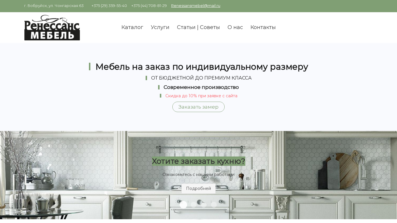 | SEO-описание | Заказать корпусную и мягкую мебель по индивидуальным размерам в Ренессанс мебель в Бобруйске, Могилёве. Индивидуальный дизайн и производство мебели по самым доступным ценам в рассрочку с доставкой и сборкой по РБ. От бюджетной до премиум мебели. Доступные цены и рассрочка. 20 лет на рынке. |