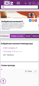 | Название / Заголовок | Бобруйская военная Комендатура - Поддержание правопорядка и военной дисциплины среди военнослужащих, обеспечение безопасности дорожного движения, контроль за состоянием службы войск.. 213827, Бобруйск, , 27 |
