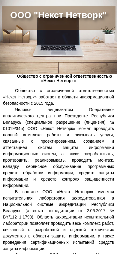 The portal NextNet.by is a limited liability company "Next Network" operating in the field of information security since 2015. As a licensee of the Operational-Analytical Center under the President of the Republic of Belarus (special permit No. 01019/345), Next Network LLC can offer a full range of services related to the design, creation, and certification of information security systems, as well as develop, produce, market, install, maintain, and service software information processing tools, information security tools, and information protection control tools. The company's testing laboratory, accredited in the National Accreditation System of the Republic of Belarus (accreditation certificate from 02.06.2017 No. BY/112 1.1798), allows for the entire range of work associated with the development and assessment