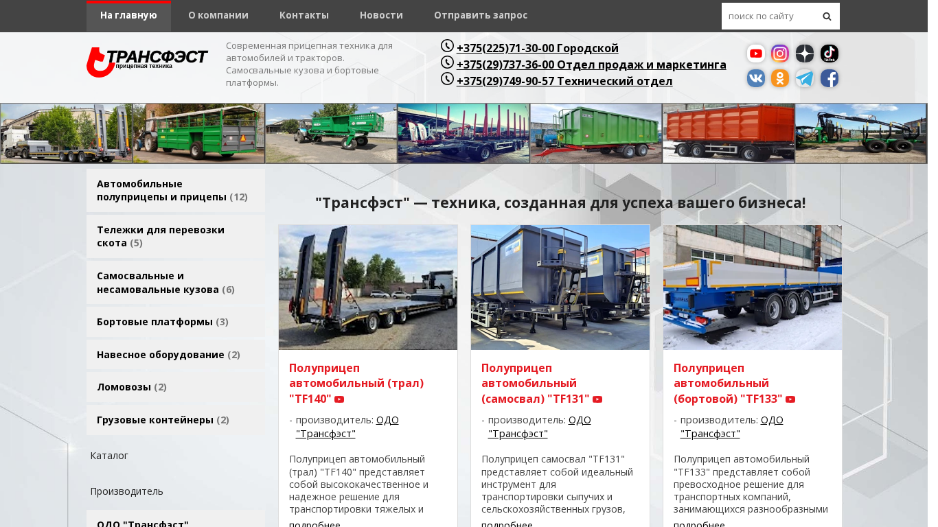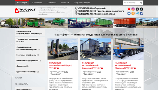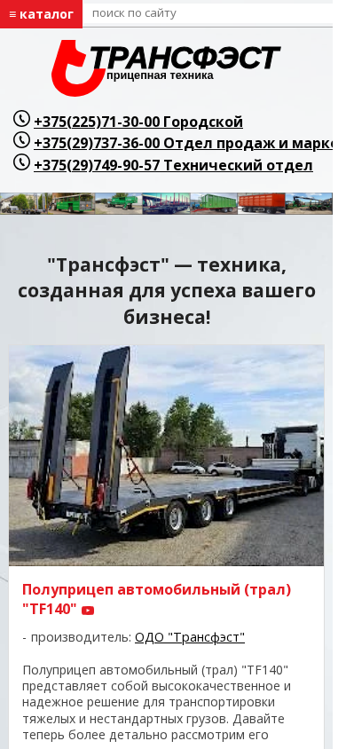 | AI-анализ | This online resource is the official website of Belarusian company ODO "Transfast," a modern producer of trailers and semi-trailers for trucks and tractors. The website offers reliable and accessible trailers and semi-trailers, with a focus on cargo transportation. Keyword topics include "automotive," "Transfast," "manufacturer," "ODO," "more info," "trailer," "semi-trailer," "transportation," "375," and "innovation." The top words indicate an emphasis on various types of automobile trailers, such as self-loading trailers and platform trailers, as well as livestock trailers and container trailers. The website provides contact information for sales, marketing, and technical support, along with a catalog of the manufacturer's offerings. Some of the featured products include the "TF140 |