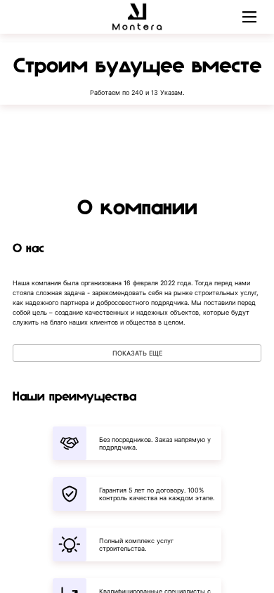 SEO-описание | Montera.by | Монтера - строительная компания в Гродно, предлагающая широкий спектр услуг: земляные работы, бетонные работы, каменные работы, монтажные работы, кровельные работы, отделочные работы, ландшафтный дизайн и инженерные сети. Гарантируем надежность, качество и соблюдение сроков. Работаем напрямую с субподрядчиками, предоставляем 5-летнюю гарантию и обеспечиваем 100% контроль качества на каждом этапе. Предлагаем удобную форму рассрочки платежей и работаем с банковскими кредитами. Получили положительные отзывы от партнеров, таких как Invest, Biocom и Shtang. |