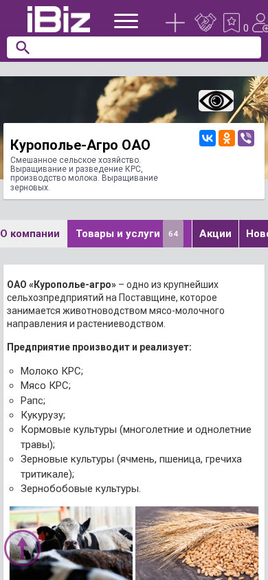 | AI-анализ | This online resource is dedicated to OAO "Kuroplje-agro," a large-scale agricultural company based in Belarus. The company specializes in mixed farming, including cattle breeding and milk production, as well as grain cultivation. The title of the website indicates its focus on "Курополье-Агро ОАО - Смешанное сельское хозяйство. Выращивание и разведение КРС, производство молока. Выращивание зерновых." The top keywords include "КРС" (CRS or cattle, raising and breeding), "услуги" (services), "сельское хозяйство" (agriculture), "выращивание" (cultivation), and "золоноводство" (grain farming). The company produces and |