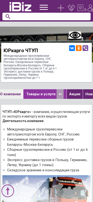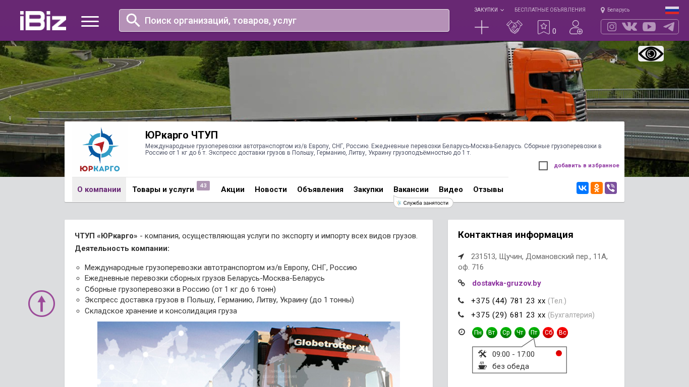 | AI-анализ | --- The website is for ЮРкарго ЧТУП, a company providing international cargo transportation services by road to and from Europe, the CIS, and Russia. Daily transits are offered between Belarus and Moscow, with consolidated cargo shipments available to Russia with weights ranging from 1 kg to 6 tons. Express delivery is available to Poland, Germany, Lithuania, and Ukraine with a capacity of up to 1 ton. The website includes a company profile, details on their services, and contact information. The address is 231513, Щучин, Домановский пер., 11A, office 716. |