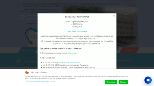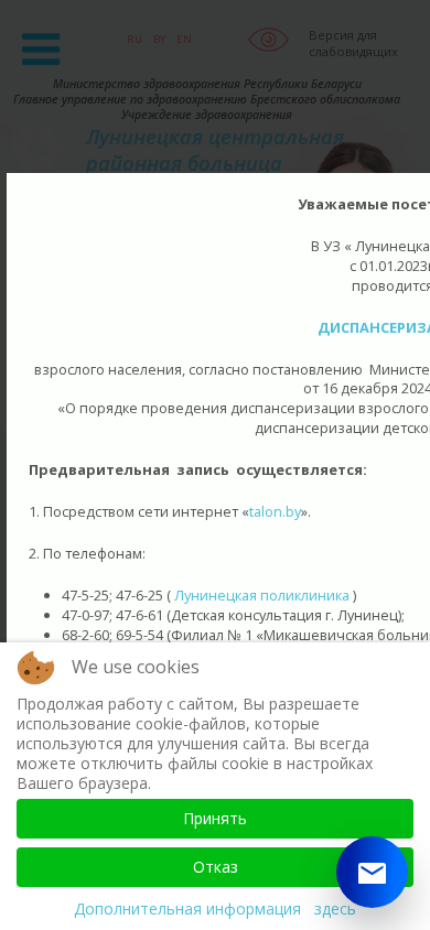 | AI-анализ | The portal 'Лунинецкая центральная районная больница' (Luninets Central Regional Hospital) is a healthcare institution in Belarus. As of January 1, 2023, it is undergoing a Dispensarization process for the adult population, according to Ministerial decrees №173 and №174 of December 16, 2024. Patients can make appointments online through the website talon.by or by phone at several numbers, including those for the Luuninec Polyclinic, Children's Consultation in Luuninec city, and the Mikashevich District Hospital's Branch 1. The website domain is lncrb.by. |
