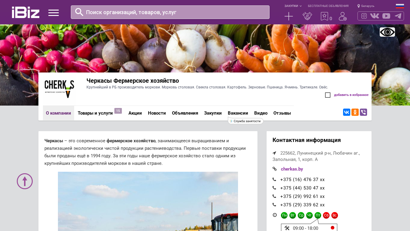 | Название / Заголовок | Черкасы Фермерское хозяйство - Крупнейший в РБ производитель моркови. Морковь столовая. Свекла столовая. Картофель. Зерновые. Пшеница. Ячмень. Тритикале. Овёс.. 225662, , Любачин аг., Запольная, 1, корп. А |