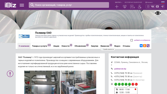| AI-анализ | The portal Polimersin.ibiz.by is a manufacturing company specializing in the production of plastic packaging and tar products using polyethylene. The product range includes polyethylene bottles, polyethylene films, bags, and packages in high and low pressure polyethylene. The company is located in the town of Luuninec, Sinkevichi Ag, Lesnaya street, number 2, and can be reached by following the provided route scheme and contact information. Polimersin.ibiz.by offers a wide range of certified products for both domestic and international markets. The production is equipped with modern machinery and uses high-quality raw materials to ensure the production of superior goods. The company's product offerings include polyethylene film, black film, colored film, thermostabilized film (GOST25951-83), bag-inserts, |