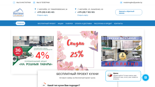 | AI-анализ | The website is for a kitchen retailer named Montanya in the city of Mogilev, Belarus. The company has two physical locations, one at Timiryazevskaya 34 and another at Lazarenko 63. Customers can contact the business via phone at +375 33 6 421 421 or +375 29 7 921 921. The website offers a free kitchen project and features a contact form for inquiries. The company's team includes Iryna, Elena, Anna, Olga, Natalia, and Natalia. Montanya's mission is to provide high-quality kitchens at reasonable prices, with a guarantee of satisfactory results. The website also includes a gallery of installed kitchens and a section on financing and delivery options. |