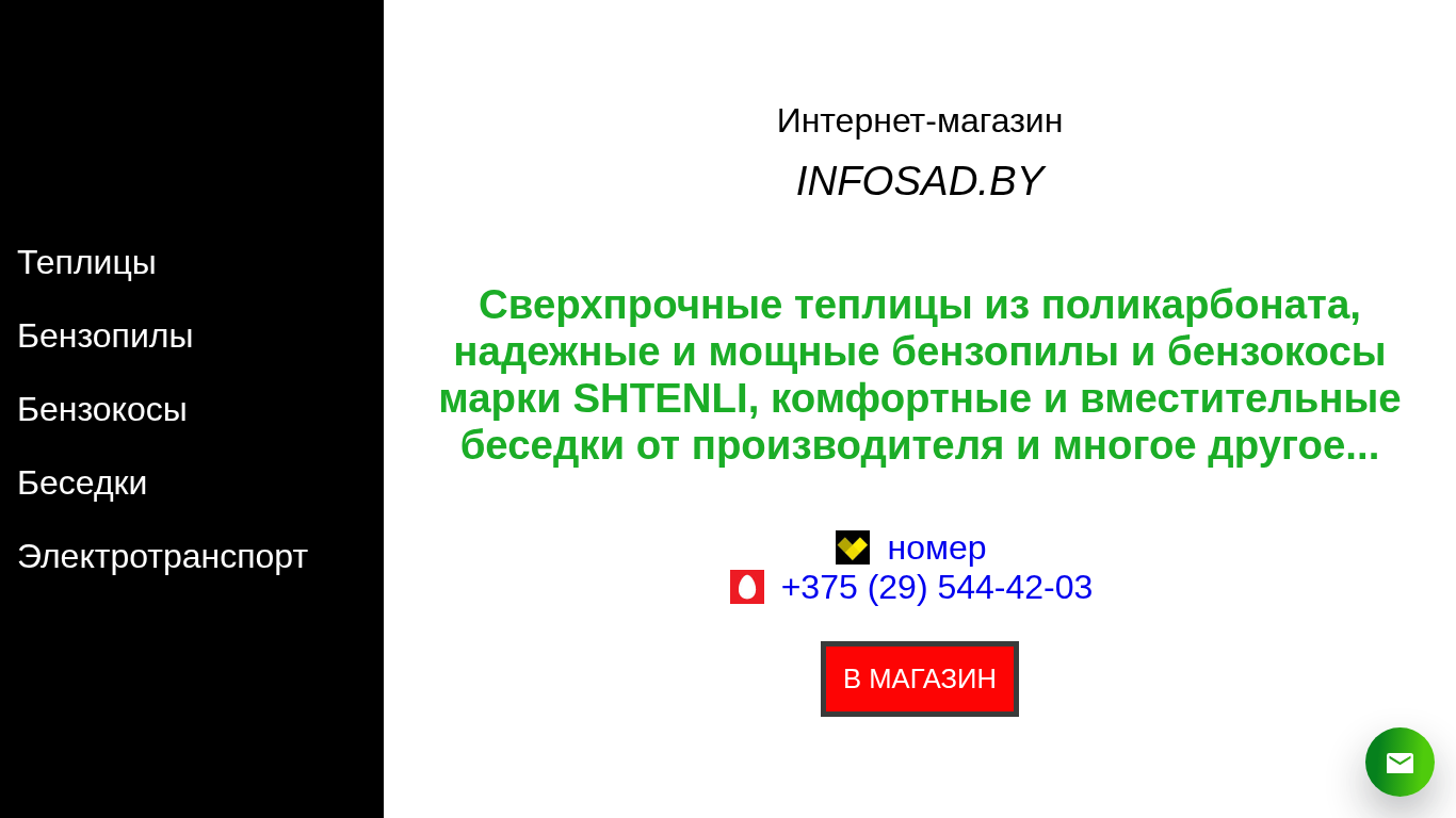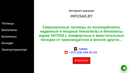 | AI-анализ | language: ru The website is an official e-commerce store selling greenhouse equipment, garden and construction tools, and accessories for landscaping dachas and private properties. The catalog features a wide range of products from Infosad, including greenhouses, greenhouses with polycarbonate panels, gazebos, carports, chain saws, lawn mowers, hedge trimmers, and bench saws. The store is located in Minsk and offers products at manufacturer's prices. Infosad is the official distributor of the garden technology displayed on the site, ensuring that customers receive items at manufacturer-set prices. Suppliers provide quality assurance through warranty commitments and adhere to consistent pricing for both retail and wholesale customers. Key product categories are greenhouses, chain saws, lawn mowers, hedge trimmers, and benchesaws. |