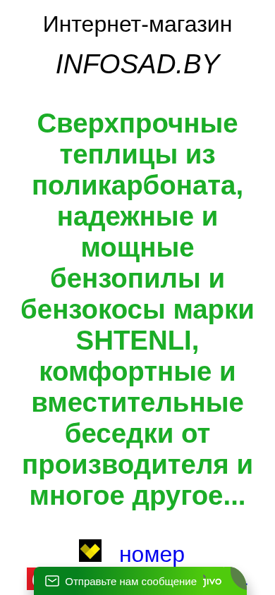 | SEO-описание | Интернет-магазин по продаже теплиц, парников, беседок из поликарбоната, садовой и строительной техники, широкий выбор товаров для благоустройства дачь и приусадебных участков. В каталоге продукции компании «ИнфоСад» вы можете выбрать и заказать садовую технику, которая вам необходима склад находится в городе Минск, товар можно преобрести по цене производителя. Мы являемся официальными дистрибьютерами садовой техники представленой на сайте, поэтому у нас цены установленны производителем. Наши поставщики подтверждают качество произведенной продукции гарантийными обязательствами и придерживаются единой политики в ценообразовании розничной и оптовой цены. |