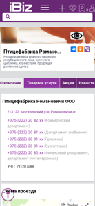 | AI-анализ | The website is a business platform for Ptycefabrika Romavichy OOO, a poultry farm located in the village of Romavichy, Mogilev Region, Belarus. The company specializes in the production and sale of poultry products, including eggs for food and incubation, day-old chicks, layer hens, and agricultural produce. The website provides contact information, including several phone numbers for different departments, such as commercial, procurement, reception, accounting, and financial departments. It also includes an address and a map for visitors. The site offers various sections for news, vacancies, and product offerings in poultry farming. The company's Unified State Register number is 791207088. |