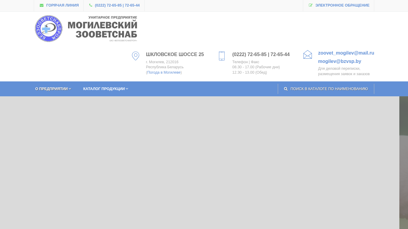 | AI-анализ | The website "Могилевский зооветснаб" (Mogilev Zoovetnab) is an official e-commerce platform for the purchase of veterinary products and animal supplies in Mogilev, Belarus. The website provides contact information, including a hotline number (0222) 72-65-85 and 72-65-44, as well as an electronic contact form. Operating hours are listed as 08.30 - 17.00 (working days) and 12.30 - 13.00 (lunch break). The website also features a regional network of veterinary pharmacies, offering a wide range of certified veterinary preparations developed by professionals. The electronic manager allows users to make product orders and inquiries. The address for the business is listed as Шк |