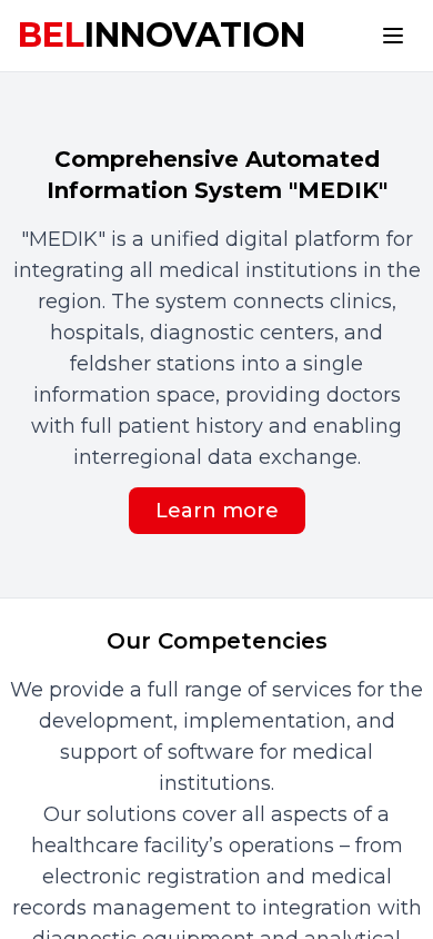 | AI-анализ | The portal Belinnovation.by is a digital solutions provider for the automation of clinics and hospitals in Belarus. It focuses on the implementation, support, and integration of IT systems in the country's healthcare sector. The primary offering is a comprehensive automated information system named "MEDIK," which aims to connect various medical institutions, including clinics, hospitals, diagnostic centers, and feldsher stations, into a single information space. This platform enables doctors to access full patient histories and facilitates interregional data exchange. The company, Belinnovation, was founded in 2012 and offers a full range of services for software development, integration with medical equipment, software adaptation, and ongoing support and maintenance. With over 13 years of successful operation, 239+ satisfied clients, and 1,041+ active users, the company has processed more than 2,0 |