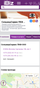 | AI-анализ | The portal is a business website for SelmashServis PKF OOO, offering current and capital repairs and restoration of specialized road-building machinery including bulldozers, excavators, and front-loading cranes. The company is located in Mogilev, Belarus, at Surgonova 13B, office 2. The contact numbers are +375 (222) 65 19 xx and +375 (29) 632 40 xx. The business operates from 9:00 to 18:00, Monday through Saturday, with no lunch break. The website also features a map for directions, company information, and a section for news, announcements, and vacancies. Additionally, users can leave reviews on popular social media platforms. The company specializes in auto-servicing for road, special |