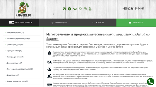 | AI-анализ | --- The portal nadvore.by offers various wooden items for sale in Minsk, with competitive prices directly from the manufacturer. Delivery and installation are available throughout Belarus. Browse and select your desired products on the website. Key product categories include gazebos, garden structures for cabins, wooden toilets, dog houses and pens, firewood storage, sandboxes for children, and shower structures for gardens. Nadvore.by has been producing and selling high-quality and attractive wooden items for many years, focusing on constructing various structures and buildings for the improvement of cottages, country houses, parks, and squares. Their team specializes in the manufacture of gazebos, dog houses, wooden toilets, and various other products. The organization employs only professionals and offers custom orders by leaving a request on the website or contacting them by phone, Viber, or WhatsApp. |