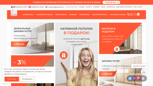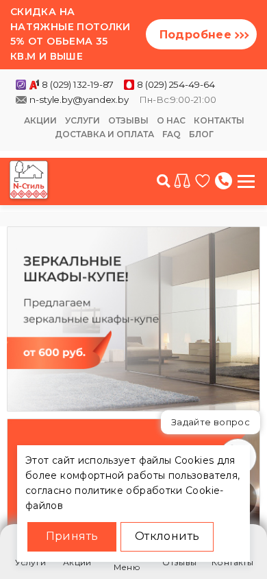 | SEO-описание | Купить шкафы-купе, натяжные потолки, двери, рольшторы, жалюзи в Минске, Молодечно, Сморгони, Мяделе, Островце, Ошмянах, Воложине. ✓Рассрочка ✓Выезд замерщика ✓Высокое качество работ. |