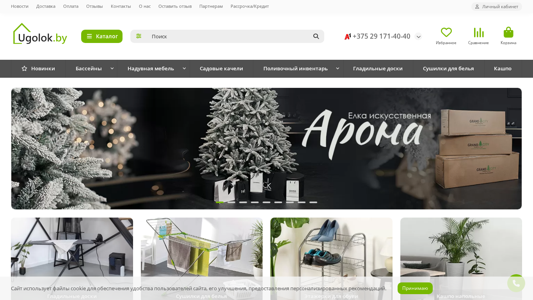 | AI-анализ | --- This website is an online home goods store named Ugolok.by based in Minsk, Belarus. The store offers various categories of items including New Year's goods, artificial trees, Christmas decorations, opt and retail sales, and both cash and non-cash payments. The site includes sections for news, delivery, payment, reviews, contacts, and about us, along with a feedback form for leaving reviews. The partner program, credit/installment plans, and favorites features are also accessible. The catalog includes categories for pools, inflatable furniture, outdoor living, bathroom and toilet, kitchen and dining, cleaning supplies, New Year's goods, and children's items. Additionally, there are sections for accessories for automobiles and climate technology. The site offers various sizes and brands of inflatable pools, carpets, and accessories, as well as cleaning and filtration systems, chemicals |