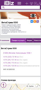 | AI-анализ | The website is a business-to-business platform for VetaStream OOO, a company located in Chelyuskiniev Street, 105A-1, in the city of Mohilev, Belarus. The company specializes in the repair and manufacturing of hydraulic cylinders of any complexity, as well as the repair of reducers. They produce and sell various parts, such as gears, zвездочек (a type of gear), and shafts. They also offer the restoration of mechanisms and bulk sales of veterinary medications. The website includes sections for company information, products and services, metallurgy and metalworking, hydraulics and pneumatics, and announcements for purchases. It features a contact section with phone numbers for technical support, sales of agricultural machinery and parts, and the company's Unified State Register number. The website also includes a |
