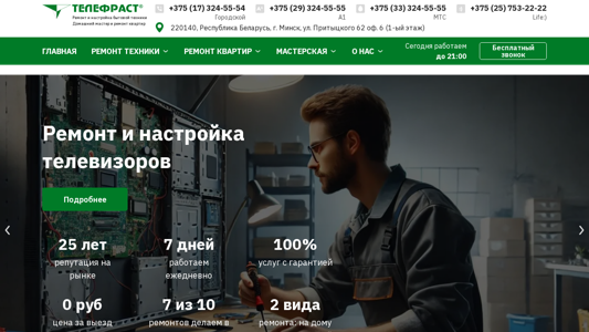 | SEO-описание | Мастерская по ремонту бытовой техники в Минске и в районе. 🔧 Выезд мастера на дом. ✅ Выгодные цены на услуги по ремонту бытовой техники. ☎️ Звоните! +375 (29) 753-22-22. |