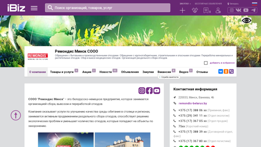 | AI-анализ | The website is a Belarusian business platform for the company "Remondis Minsk SOOO" which deals with the collection, transportation, and processing of various types of waste. The company offers services to improve living conditions in the capital and regions by promoting separate waste collection, addressing ecological issues, and reducing the amount of waste that ends up in landfills. Services include the organization of separate waste collection, removal and disposal of solid household waste, collection and transportation of construction waste and large items, disposal of medical waste, and processing of hazardous waste. The website also features a section for purchasing secondary materials such as gravel and fuel chips, as well as information about the company and its activities. The domain name is remondis.ibiz.by. |