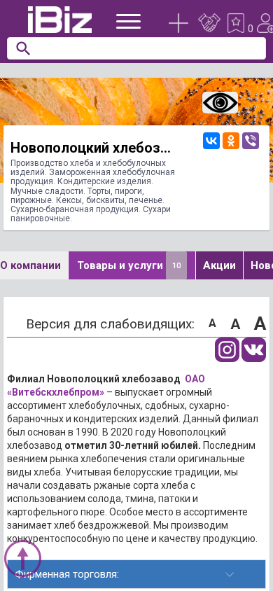 | AI-анализ | This website is a branch of Novopolotsk Bread Factory OAO Vitsebskhlebprom, specializing in the production of bread and baked goods, including frozen bakery products, confectionery items, sweet baked goods, cakes, pies, pastries, cookies, biscuits, and sugary candies. The branch is located in Novopolotsk, Belarus, at Komsomoskaya Street 14. |