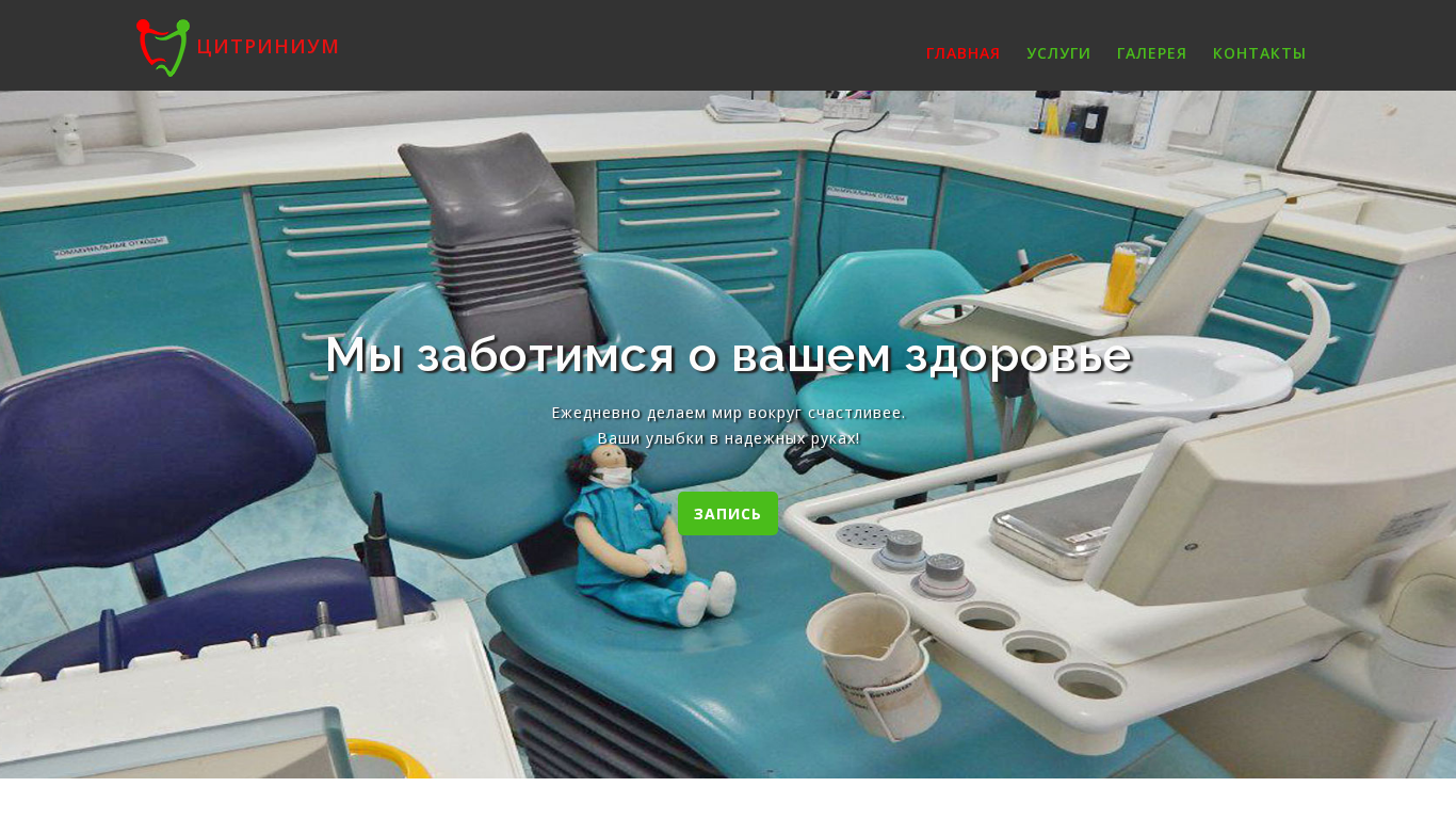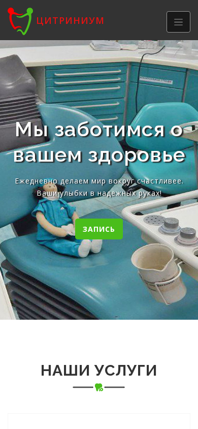 | AI-анализ | The portal Citrinium is a dental clinic website offering various services related to oral health. The title is 'Цитриниум', and the description includes words like 'услуги' (services), 'галерея' (gallery), 'контакты' (contacts), and 'стоматология' (dentistry). The website focuses on taking care of its clients' health daily and making the world around them happier. The services provided include aesthetic and regular dental procedures, and they offer solutions for tooth problems of any complexity. The website features a gallery for viewing their work and allows users to book appointments. The clinic is located in Novopolotsk on Jubileina Street, and their contacts include a phone number, email address, and MTS number. The website is operated Monday to Friday from 08:30 to 19:00, with a |