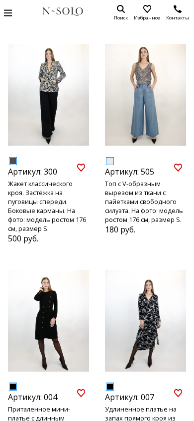 | AI-анализ | The web project N-SOLO is an online catalog featuring various clothing items for women. The title of the website is "N-SOLO". Some of the top keywords associated with the site include "модель" (model), "артикул" (article), "фото" (photo), "ростом" (height), "176" (a specific height), "размер" (size), "руб" (Russian currency), "спереди" (in front), "длинным" (long), "рукавом" (sleeve), "заст" (fastening), "без" (without), "силуэта" (silhouette), "жка" (jacket), "пуговицы" (buttons), "боковые" (side), "карманы" (pockets), and "карманов" |