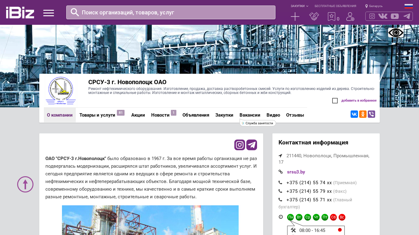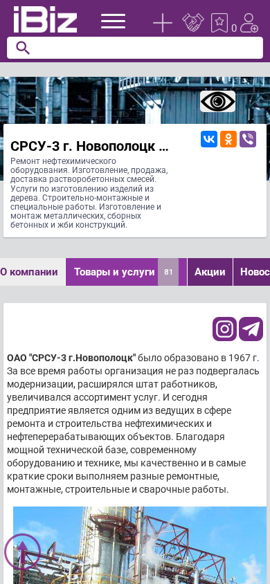| AI-анализ | The portal is a Belarusian industrial company, SRSU-3 g. Novopolotsk OAO, located in the industrial area of Novopolotsk, Belarus. The company specializes in the repair and maintenance of petrochemical equipment, as well as the production, sales, and delivery of ready-mixed concrete. They offer services for the production of wooden items and provide construction, installation, and specialized works. The company also produces and installs metal, prefabricated concrete, and reinforced concrete structures. The business was founded in 1967 and has since undergone modernization, expanded its workforce, and increased its range of services. Today, it is a leading player in the field of repair and construction for petrochemical and petroleum processing facilities, thanks to its strong technical base, modern equipment, and technology. The company consists of five repair-construction |