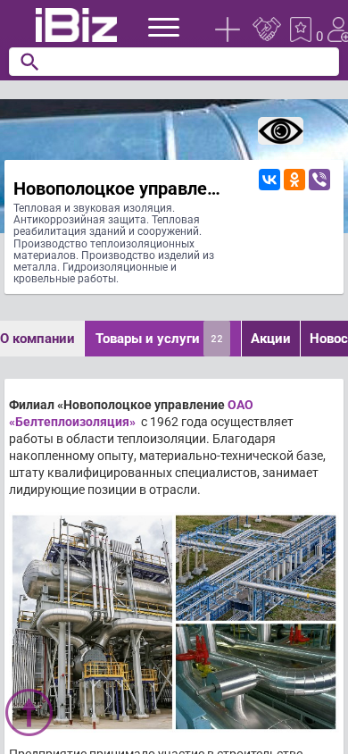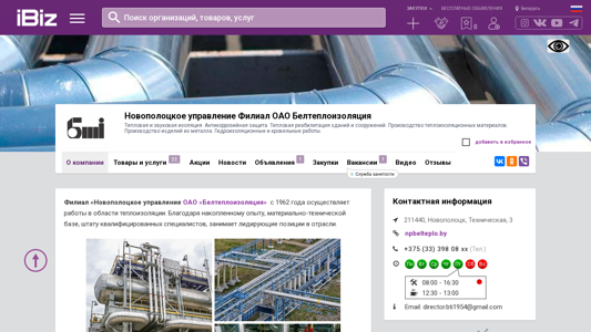 AI-анализ | This website is for the Novopolotsk Branch of OAO Belteploizolatsia, a Belarusian company specializing in thermal and sound insulation, anti-corrosion protection, thermal rehabilitation of buildings and structures, production of thermal insulation materials, and production of metal items. The company also provides hydraulic insulation and roofing services. The address of the company is 211440, Novopoltsk, Technicheskaya, 3. The company's products and services include insulation materials, metal items, and various construction and repair works. The company has a long history, having been in operation since 1962, and has contributed to the construction of numerous industrial and infrastructure projects in various cities in Belarus and beyond. The main production units of the branch include a section for glass fiber insulation and a section for metal production |