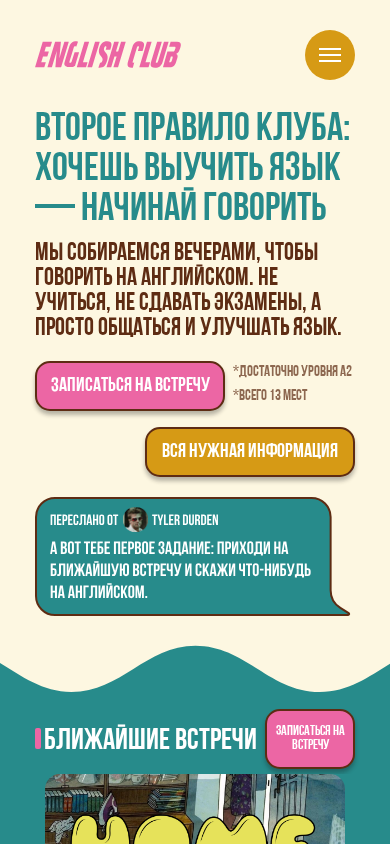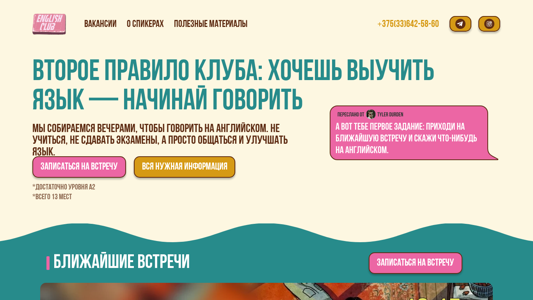 | SEO-описание | Без стресса и зубрежки. Практика английского на живых встречах: интересные темы, поддержка для любого уровня, дружелюбная атмосфера. Запишитесь на встречу. |