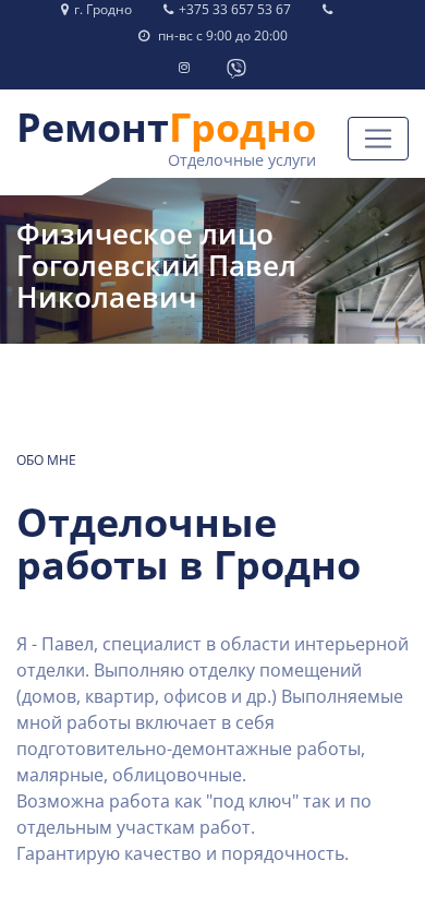 | SEO-описание | Отделочные работы под ключ в Гродно от специалиста в области ремонтных работ. Физлицо Гоголевский осуществляет полный комплекс услуг по ремонту квартир и домов |
