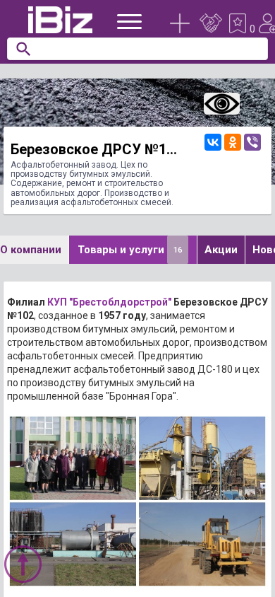 | Название / Заголовок | Березовское ДРСУ №102 Филиал КУП Брестоблдорстрой - Асфальтобетонный завод. Цех по производству битумных эмульсий. Содержание, ремонт и строительство автомобильных дорог. Производство и реализация асфальтобетонных смесей.. 225210, Береза, , Красноармейская, 86 |